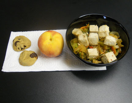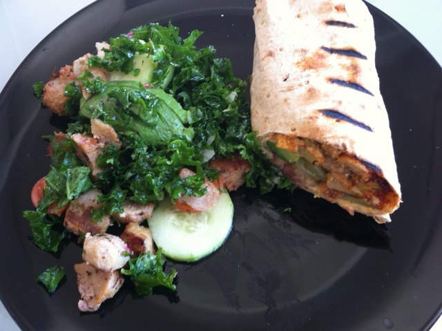 The Menu: The chicken shawarma—a wrap with soy chicken, potatoes, pickles, hummus, avocado, harissa, and magic—plus kale salad with soy chicken and avocado.